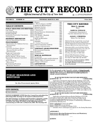 The City Record newspaper publishes notices which includes but is not limited to public hearings and meetings, public auctions and sales, solicitations and awards and official rules proposed and adopted by city agencies.