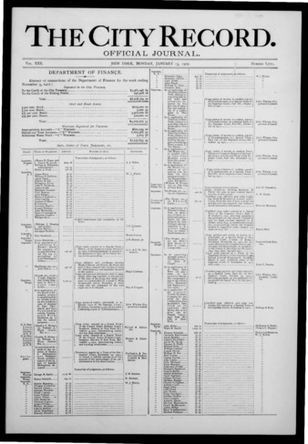 The City Record newspaper publishes notices which includes but is not limited to: public hearings and meetings, public auctions and sales, solicitations and awards and official rules proposed and adopted by city agencies. This is the City Record Newspaper for January 13, 1902.