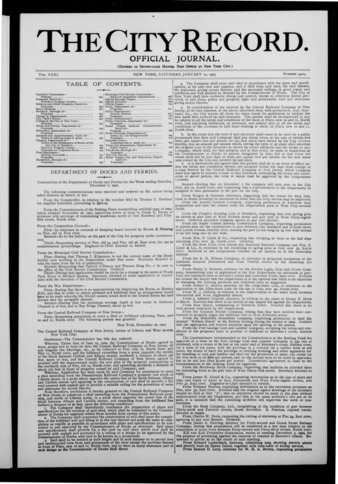 The City Record newspaper publishes notices which includes but is not limited to: public hearings and meetings, public auctions and sales, solicitations and awards and official rules proposed and adopted by city agencies. This is the City Record Newspaper for January 10, 1903.