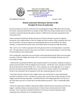 After 25 years of service, including more than 20 years as its director, Ronnie Lowenstein will retire from the IBO later this month. George Sweeting, IBO’s deputy director will become acting director. IBO congratulates Ronnie on her retirement & is grateful for her many years of service.