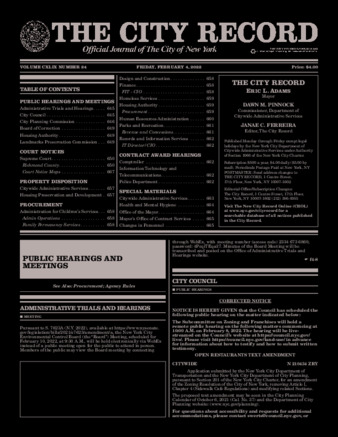 The City Record newspaper publishes notices which includes but is not limited to: public hearings and meetings, public auctions and sales, solicitations and awards and official rules proposed and adopted by city agencies.