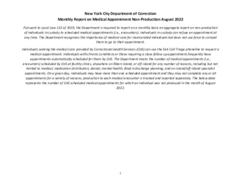 Pursuant to Local Law 132 of 2019, the Department is required to report on a monthly basis an aggregate report on non-production of individuals in custody to scheduled medical appointments. The data within the report represents the non-unique number of incarcerated individuals who were not produced.