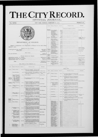 The City Record newspaper publishes notices which includes but is not limited to: public hearings and meetings, public auctions and sales, solicitations and awards and official rules proposed and adopted by city agencies. This is the City Record Newspaper for February 26, 1900.