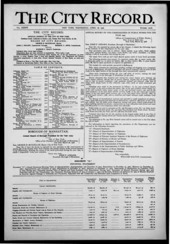 The City Record newspaper publishes notices which includes but is not limited to: public hearings and meetings, public auctions and sales, solicitations and awards and official rules proposed and adopted by city agencies. This is the City Record Newspaper for April 18, 1906.