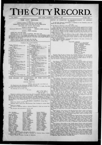 The City Record newspaper publishes notices which includes but is not limited to: public hearings and meetings, public auctions and sales, solicitations and awards and official rules proposed and adopted by city agencies. This is the City Record Newspaper for August 01, 1907.
