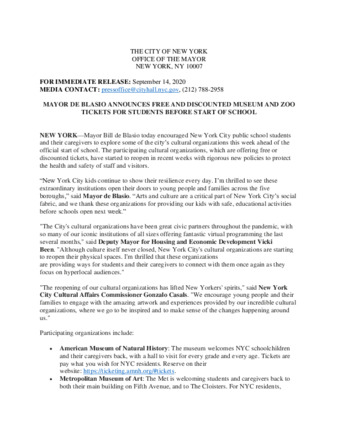 Mayor's Press Release: MAYOR DE BLASIO ANNOUNCES FREE AND DISCOUNTED MUSEUM AND ZOO TICKETS FOR STUDENTS BEFORE START OF SCHOOL