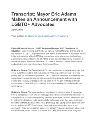 Transcript: Mayor Eric Adams Makes an Announcement with LGBTQ+ Advocates