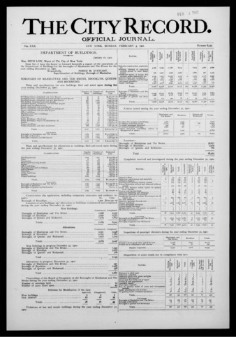 The City Record newspaper publishes notices which includes but is not limited to: public hearings and meetings, public auctions and sales, solicitations and awards and official rules proposed and adopted by city agencies. This is the City Record Newspaper for February 03, 1902.