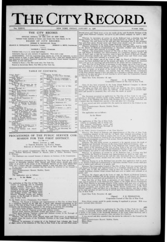 The City Record newspaper publishes notices which includes but is not limited to: public hearings and meetings, public auctions and sales, solicitations and awards and official rules proposed and adopted by city agencies. This is the City Record Newspaper for January 10, 1908.