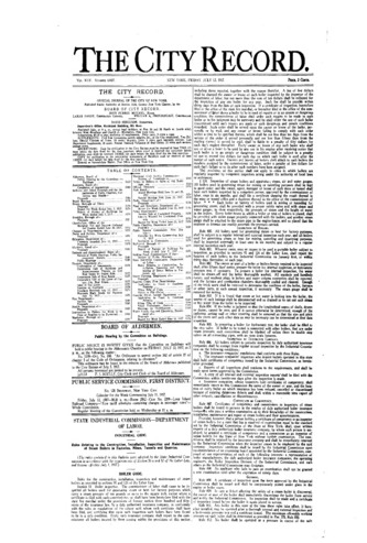The City Record newspaper publishes notices which includes but is not limited to: public hearings and meetings, public auctions and sales, solicitations and awards and official rules proposed and adopted by city agencies. This is the City Record Newspaper for July 13, 1917.