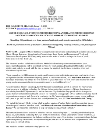 Mayor's Press Release: MAYOR DE BLASIO, DYCD COMMISSIONER CHONG AND HRA COMMISSIONER BANKS ANNOUNCE ENHANCED SERVICES TO ADDRESS YOUTH HOMELESSNESS