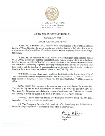Emergency Executive Order No. 214, extends Emergency Executive Order No. 209, dated September 22, 2022, for five (5) days, if this relates to Infant Formula Shortage.