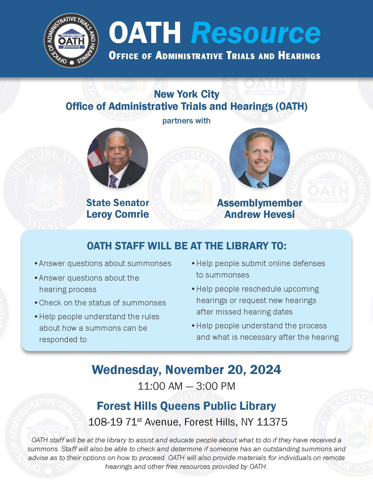 OATH staff were at the library to assist and educate people about what to do should they have received a summons and to check to determine if someone has an outstanding summons. Materials about remote hearings and other free resources were provided to the public as well.