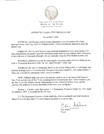 Emergency Executive Order No. 882, is being submitted to extend Emergency Executive Order No. 880, dated November 4, 2025; for five (5); days as it relates to the state of emergency based on the arrival of thousands of individuals and families seeking asylum.