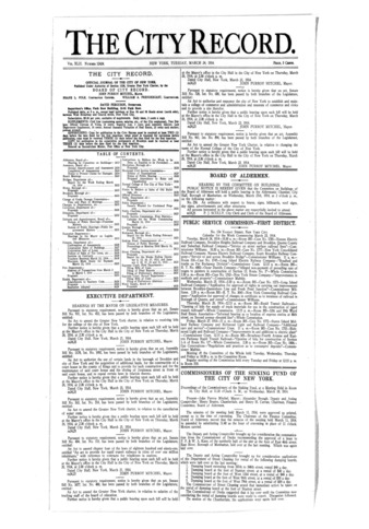 The City Record newspaper publishes notices which includes but is not limited to: public hearings and meetings, public auctions and sales, solicitations and awards and official rules proposed and adopted by city agencies. This is the City Record Newspaper for March 24, 1914 with supplement.