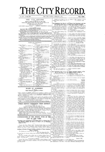 The City Record newspaper publishes notices which includes but is not limited to: public hearings and meetings, public auctions and sales, solicitations and awards and official rules proposed and adopted by city agencies. This is the City Record Newspaper for February 08, 1916.