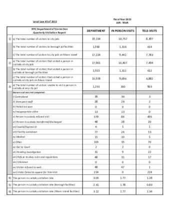 Pursuant to Local Law 85 of 2015, the department provides information pertaining to the visitation of the incarcerated population in city jails for the prior quarter. This report includes data on the number of visitors to Rikers Island and Borough facilities.