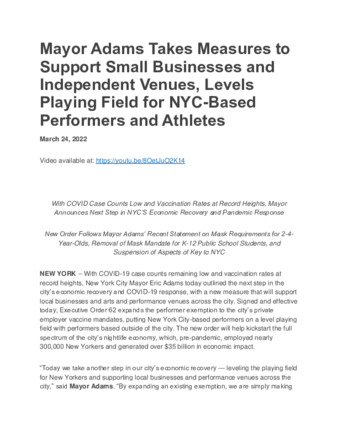 Mayor Adams Takes Measures to Support Small Businesses and Independent Venues, Levels Playing Field for NYC-Based Performers and Athletes