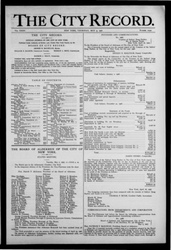 The City Record newspaper publishes notices which includes but is not limited to: public hearings and meetings, public auctions and sales, solicitations and awards and official rules proposed and adopted by city agencies. This is the City Record Newspaper for May 09, 1907.