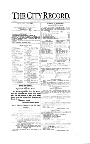 The City Record newspaper publishes notices which includes but is not limited to: public hearings and meetings, public auctions and sales, solicitations and awards and official rules proposed and adopted by city agencies. This is the City Record Newspaper for December 30, 1909.