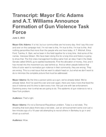A transcript about New York City Mayor Eric Adams and A.T. Williams announcing the formation of the Gun Violence Prevention Task Force.