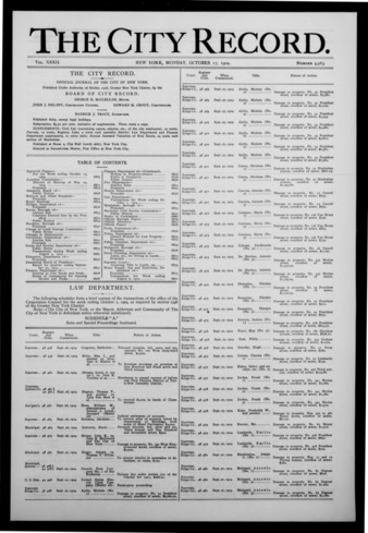 The City Record newspaper publishes notices which includes but is not limited to: public hearings and meetings, public auctions and sales, solicitations and awards and official rules proposed and adopted by city agencies. This is the City Record Newspaper for October 17, 1904.