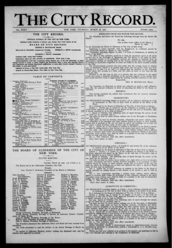 The City Record newspaper publishes notices which includes but is not limited to: public hearings and meetings, public auctions and sales, solicitations and awards and official rules proposed and adopted by city agencies. This is the City Record Newspaper for March 28, 1907.