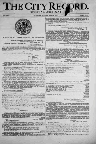 The City Record newspaper publishes notices which includes but is not limited to: public hearings and meetings, public auctions and sales, solicitations and awards and official rules proposed and adopted by city agencies. This is the City Record Newspaper for May 28, 1901.
