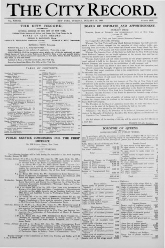 The City Record newspaper publishes notices which includes but is not limited to: public hearings and meetings, public auctions and sales, solicitations and awards and official rules proposed and adopted by city agencies. This is the City Record Newspaper for January 19, 1909.