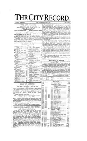 The City Record newspaper publishes notices which includes but is not limited to: public hearings and meetings, public auctions and sales, solicitations and awards and official rules proposed and adopted by city agencies. This is the City Record Newspaper for April 05, 1915.