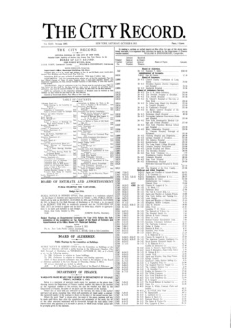 The City Record newspaper publishes notices which includes but is not limited to: public hearings and meetings, public auctions and sales, solicitations and awards and official rules proposed and adopted by city agencies. This is the City Record Newspaper for October 09, 1915.