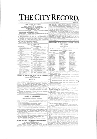 The City Record newspaper publishes notices which includes but is not limited to: public hearings and meetings, public auctions and sales, solicitations and awards and official rules proposed and adopted by city agencies. This is the City Record Newspaper for October 28, 1915.