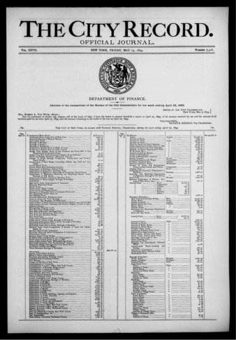 The City Record newspaper publishes notices which includes but is not limited to: public hearings and meetings, public auctions and sales, solicitations and awards and official rules proposed and adopted by city agencies. This is the City Record Newspaper for May 19, 1899.