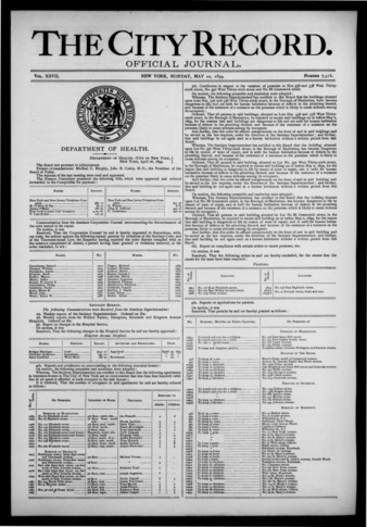 The City Record newspaper publishes notices which includes but is not limited to: public hearings and meetings, public auctions and sales, solicitations and awards and official rules proposed and adopted by city agencies. This is the City Record Newspaper for May 22, 1899.