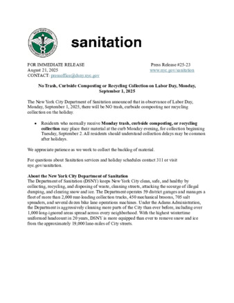 NYC Sanitation announced that in observance of Labor Day, Monday, September 1, 2025, there will be NO trash, curbside composting nor recycling collection on the holiday.