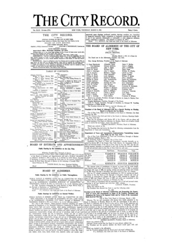 The City Record newspaper publishes notices which includes but is not limited to: public hearings and meetings, public auctions and sales, solicitations and awards and official rules proposed and adopted by city agencies. This is the City Record Newspaper for March 04, 1915.