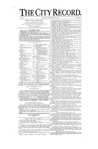 The City Record newspaper publishes notices which includes but is not limited to: public hearings and meetings, public auctions and sales, solicitations and awards and official rules proposed and adopted by city agencies. This is the City Record Newspaper for February 02, 1912.