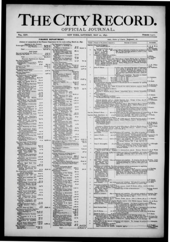 The City Record newspaper publishes notices which includes but is not limited to: public hearings and meetings, public auctions and sales, solicitations and awards and official rules proposed and adopted by city agencies. This is the City Record Newspaper for May 22, 1897.