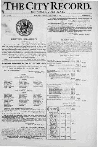 The City Record newspaper publishes notices which includes but is not limited to: public hearings and meetings, public auctions and sales, solicitations and awards and official rules proposed and adopted by city agencies. This is the City Record Newspaper for November 09, 1900.