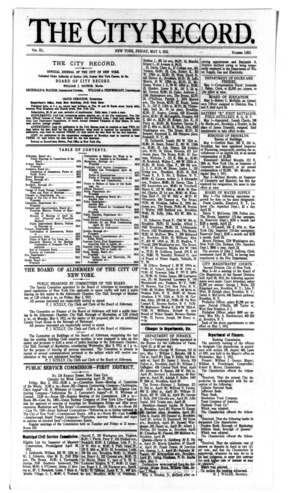The City Record newspaper publishes notices which includes but is not limited to: public hearings and meetings, public auctions and sales, solicitations and awards and official rules proposed and adopted by city agencies. This is the City Record Newspaper for May 03, 1912.