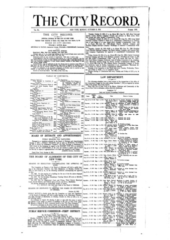 The City Record newspaper publishes notices which includes but is not limited to: public hearings and meetings, public auctions and sales, solicitations and awards and official rules proposed and adopted by city agencies. This is the City Record Newspaper for October 21, 1912.