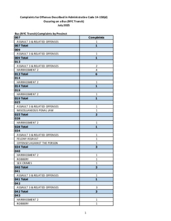 Pursuant to Admin Code Sect. 14-150(d), this monthly report contains information on complaints and arrests for violent felony offenses, assault, sex offenses, disorderly conduct, harassment, aggravated harassment, and offenses against public sensibilities that occurred in transit