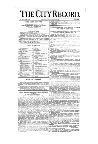 The City Record newspaper publishes notices which includes but is not limited to: public hearings and meetings, public auctions and sales, solicitations and awards and official rules proposed and adopted by city agencies. This is the City Record Newspaper for February 03, 1914.