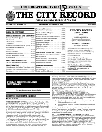 The City Record newspaper publishes notices which includes but is not limited to public hearings and meetings, public auctions and sales, solicitations and awards and official rules proposed and adopted by city agencies.