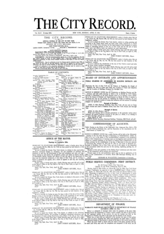 The City Record newspaper publishes notices which includes but is not limited to: public hearings and meetings, public auctions and sales, solicitations and awards and official rules proposed and adopted by city agencies. This is the City Record Newspaper for April 17, 1916.