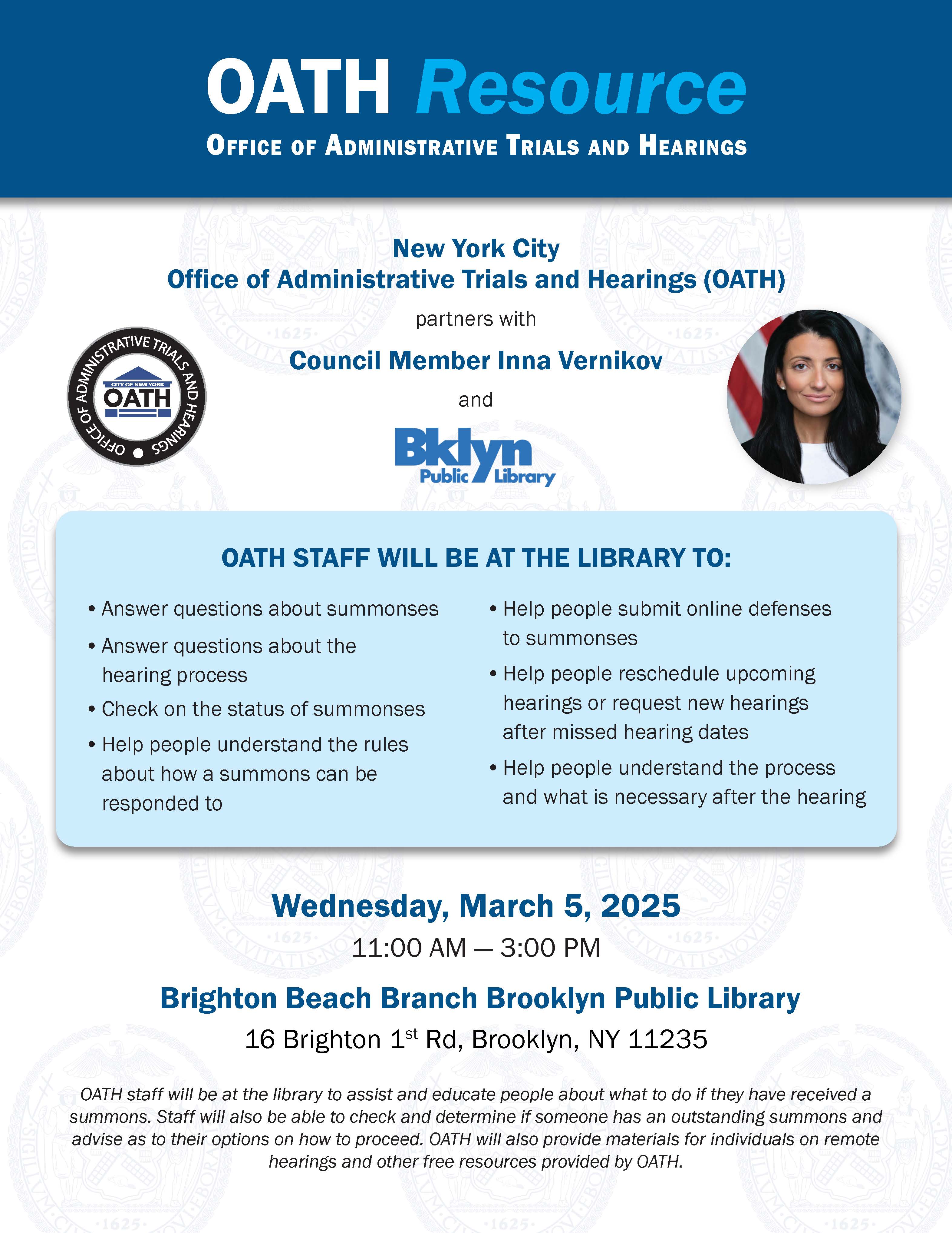 OATH staff were at the library to assist and educate people about what to do should they have received a summons and to check to determine if someone has an outstanding summons. Materials about remote hearings and other free resources were provided to the public as well.