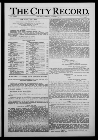 The City Record newspaper publishes notices which includes but is not limited to: public hearings and meetings, public auctions and sales, solicitations and awards and official rules proposed and adopted by city agencies. This is the City Record Newspaper for October 11, 1904.