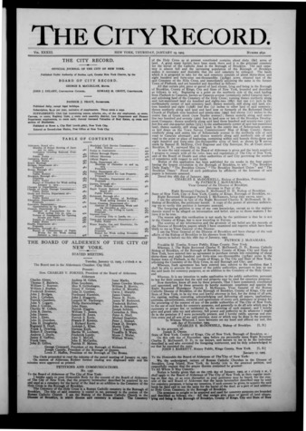 The City Record newspaper publishes notices which includes but is not limited to: public hearings and meetings, public auctions and sales, solicitations and awards and official rules proposed and adopted by city agencies. This is the City Record Newspaper for January 19, 1905.