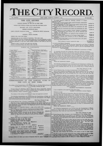 The City Record newspaper publishes notices which includes but is not limited to: public hearings and meetings, public auctions and sales, solicitations and awards and official rules proposed and adopted by city agencies. This is the City Record Newspaper for March 07, 1905.