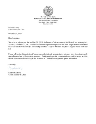 Dear Licensee: We write to inform you that on May 31, 2025, the license of micro-hauler Afterlife AG, Inc. was expired. As such, Afterlife AG, Inc., a collector of source-separated organic waste, is no longer authorized to haul trade waste in New York City.